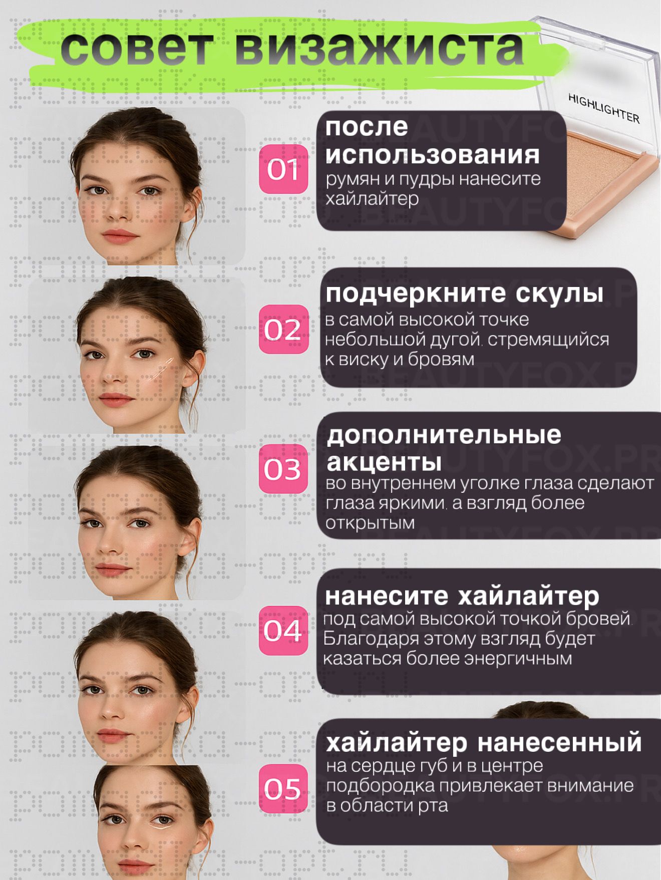 Добавьте сияющий хайлайтер в вашу коллекцию макияжа и насладитесь ярким, люминесцентным эффектом для себя.