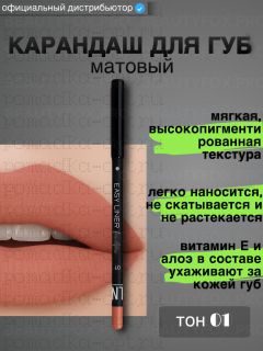 Способ применения: обведите губы контурным карандашом, затем нанесите помаду или блеск для губ. После использования хорошо закройте карандаш, чтобы стержень оставался мягким и эластичным.