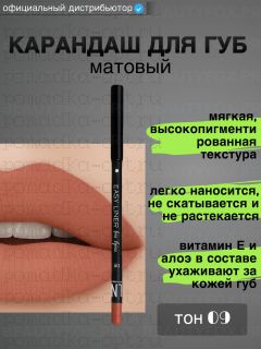 Именно благодаря ему помада не растекается за границы, а губы приобретают красивый, четкий контур. Мягкий высокопигментированный матовый карандаш Easy Liner for Lips легко наносится, не растекается и не скатывается в течение дня. Линия контура губ получается тонкая и равномерная, без комочков. Формула с содержанием витаминов и алоэ бережно ухаживает за деликатной кожей губ. Также в составе карандаша есть пчелиный воск, который прекрасно смягчает и увлажняет губы, благодаря чему продукт не пересушивает их. Карандаш легко затачивается.