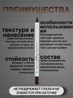 Стойкий гелевый карандаш для глаз создан специалистами бренда Lamel Professional, чтобы подчеркнуть глубину и выразительность взгляда. Насыщенный оттенок, легкость нанесения и бесподобная стойкость покорят даже самых искушенных бьютиголиков. С помощью практичного средства вы легко, быстро и аккуратно сможете сделать как сдержанный дневной, так и насыщенный вечерний макияж. Гелевая текстура превратит привычный процесс в настоящий ритуал красоты, поскольку средство мягко наносится, оставляя ровные и красивые штрихи и линии.