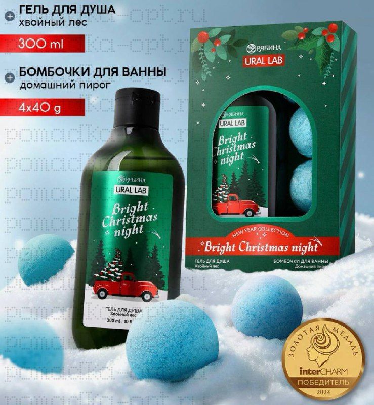 Новогодний подарочный набор косметики Bright Christmas night: гель для душа, 300 мл и бомбочки для ванны, 4×40 г,