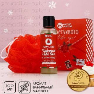 Новогодний подарочный набор косметики «Счастливого праздника», гель для душа 100 мл и мочалка для тела,