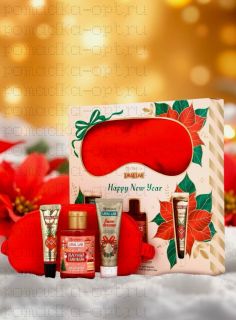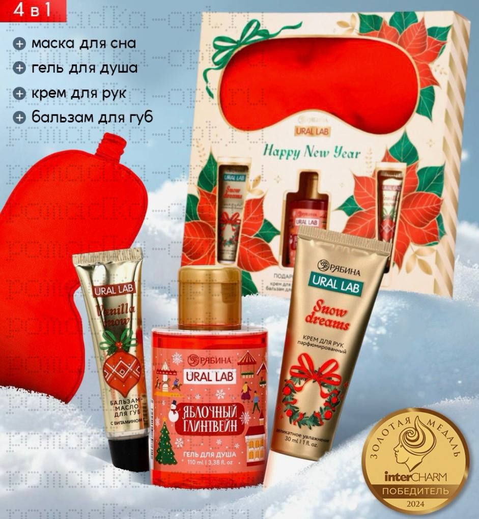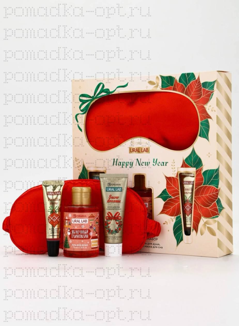 Новогодний подарочный набор косметики: гель для душа, крем для рук, бальзам для губ, маска для сна,
