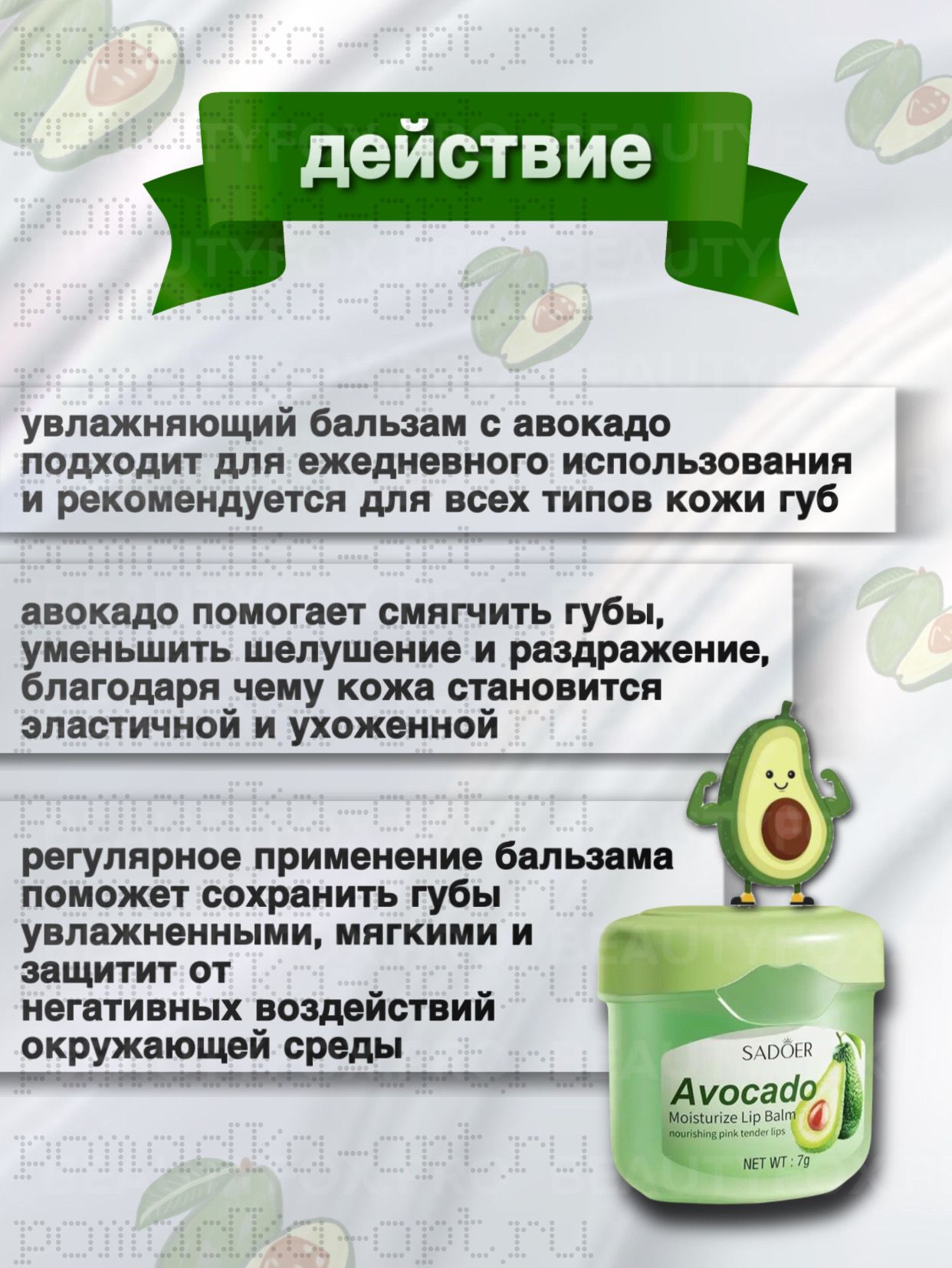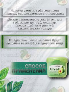 Почувствуй солнечное летнее настроение с бальзамом для губ Sadoer Avokado Moisturize Lip Balm с ароматом авокадо! Бальзам придаст твоим губам нежность и гладкость. Входящие в состав масла ши и персика, витамины F и Е глубоко увлажнят и питают, защищают кожу губ от сухости и шелушения.