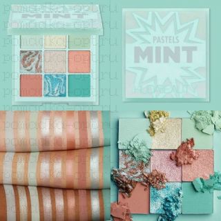 Палетка теней Huda Beauty Mint Obsessions предлагает нежные пастельные оттенки в зелёной гамме. Она включает уникальный баланс теплых и холодных тонов, позволяя создать макияж с мятными, яблочно-зелеными, фисташковыми, бирюзовыми, ледяными аква-оттенками, а также медово-бронзовыми и матовыми оттенками загара. Тени жидкой текстуры, не содержат парабенов и не тестируются на животных